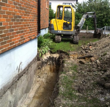 - Utgrävning: Grävning av diken runt husgrunden för att skapa utrymme för dräneringssystemet.